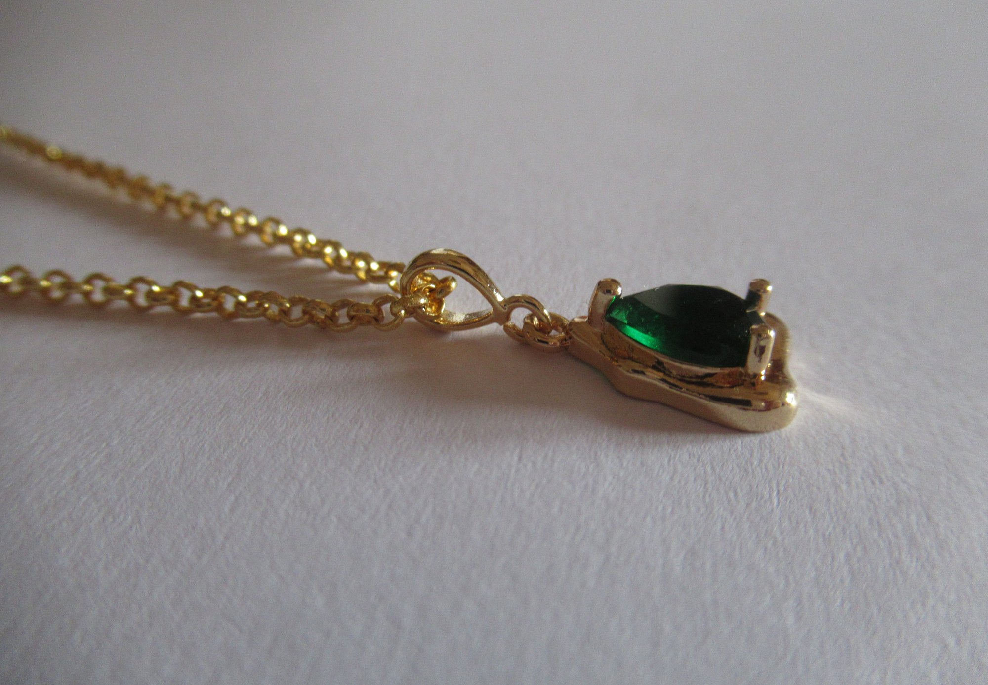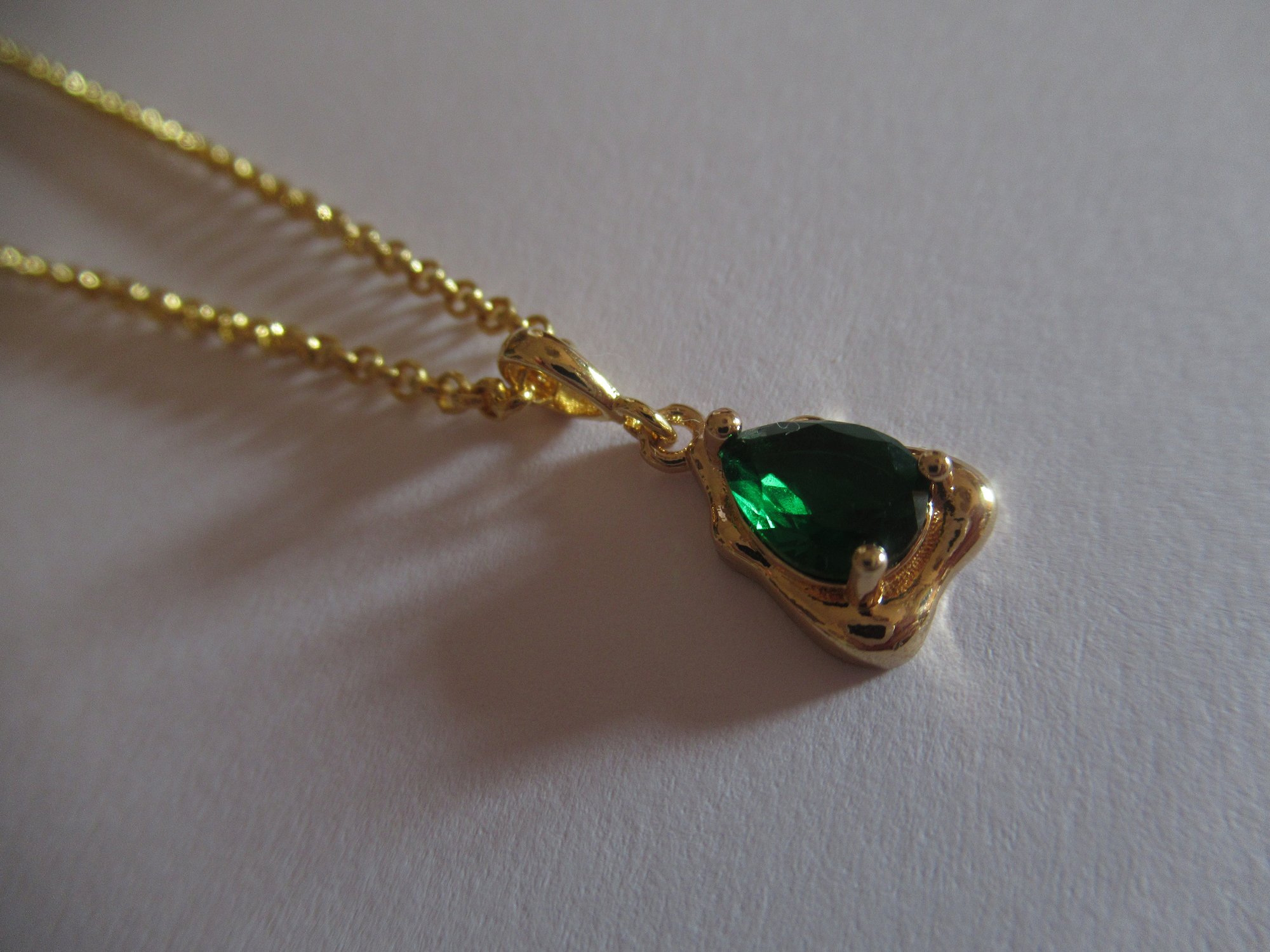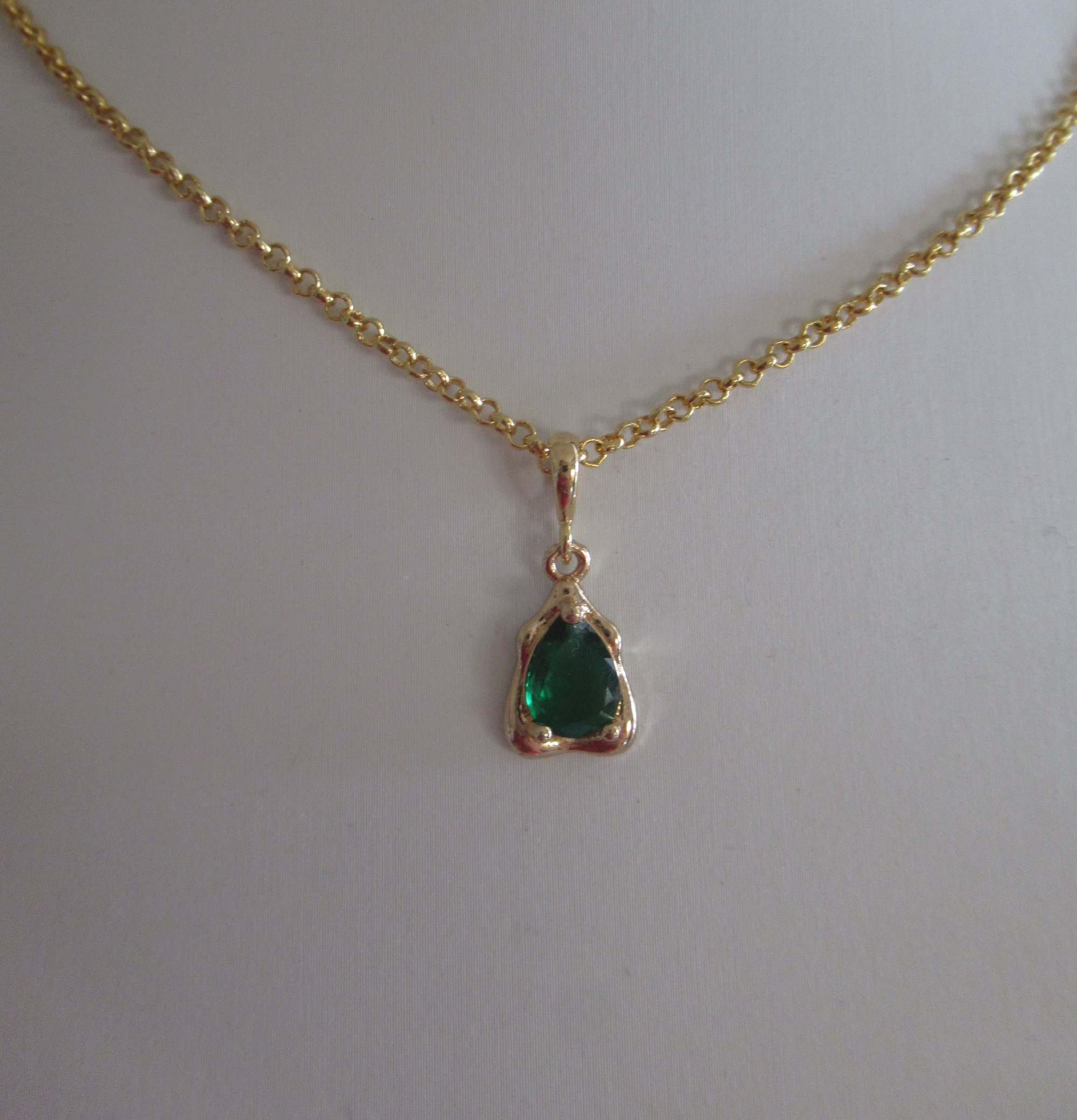 A luminous teardrop emerald crystal is set in a refined yellow gold-plated setting and suspended from a delicate adjustable gold rolo chain (16"–18" / 40–45 cm), echoing the effortless elegance of Meghan’s iconic necklace.